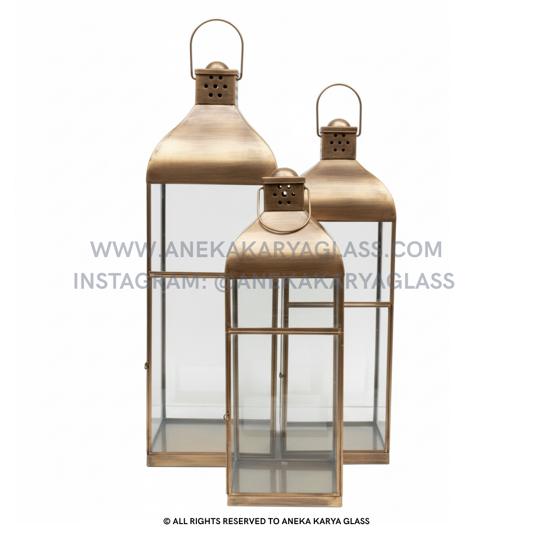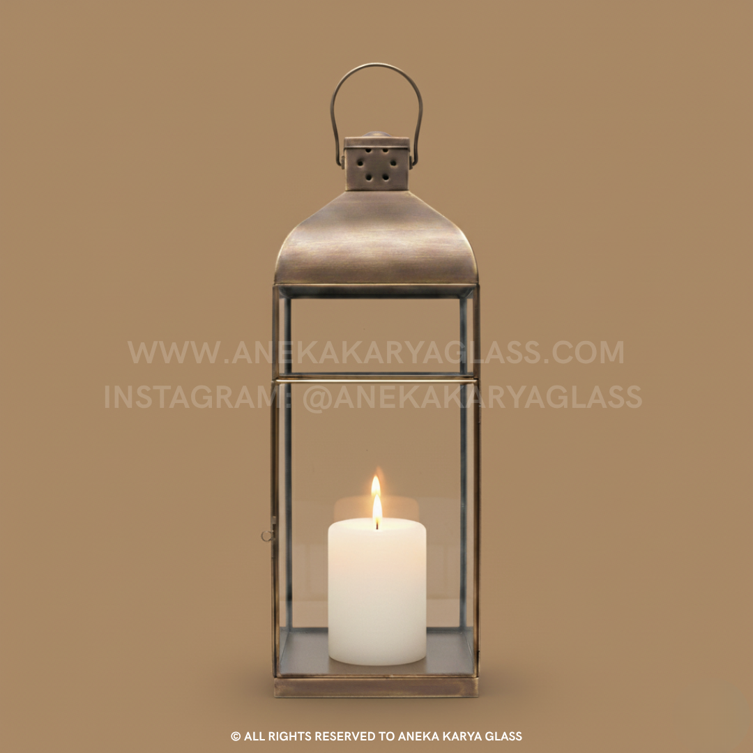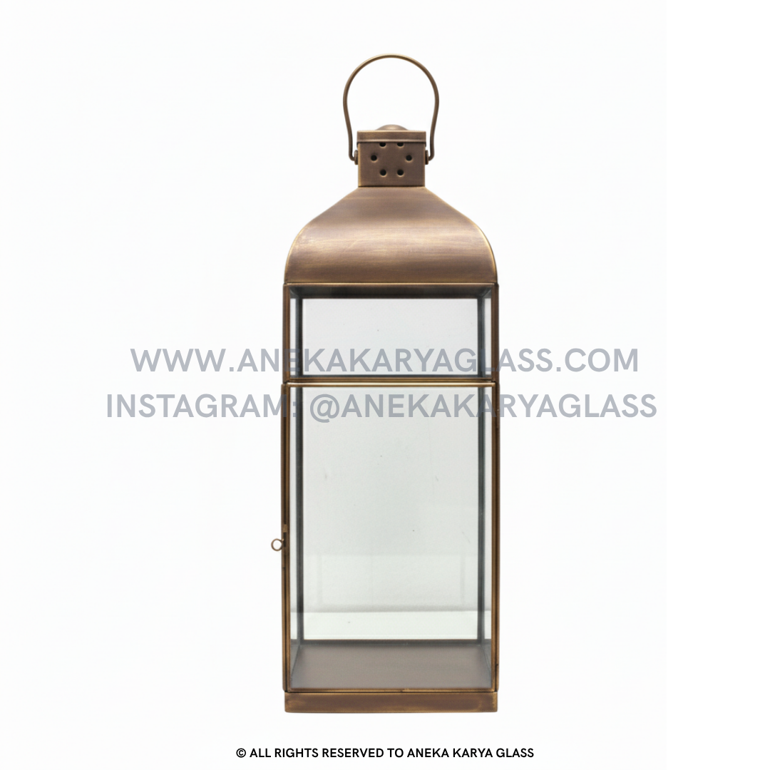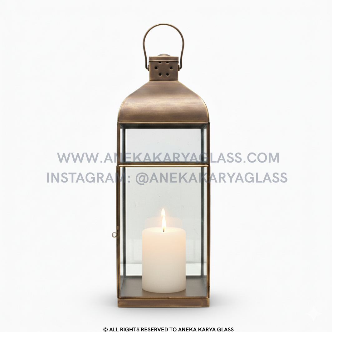 Square lantern made from clear glass and antique brass, showcasing precise handcraftsmanship and timeless form.
