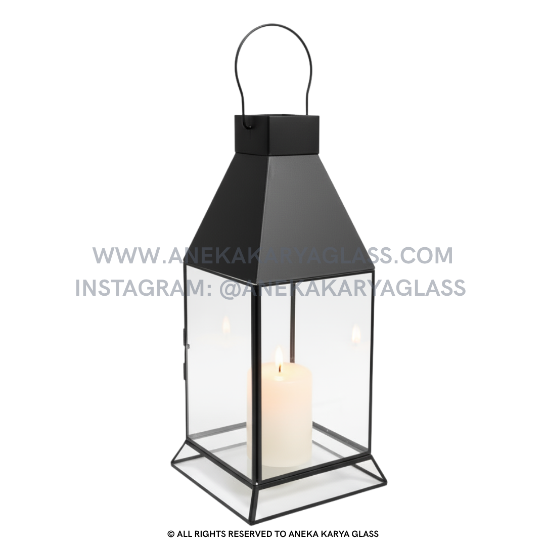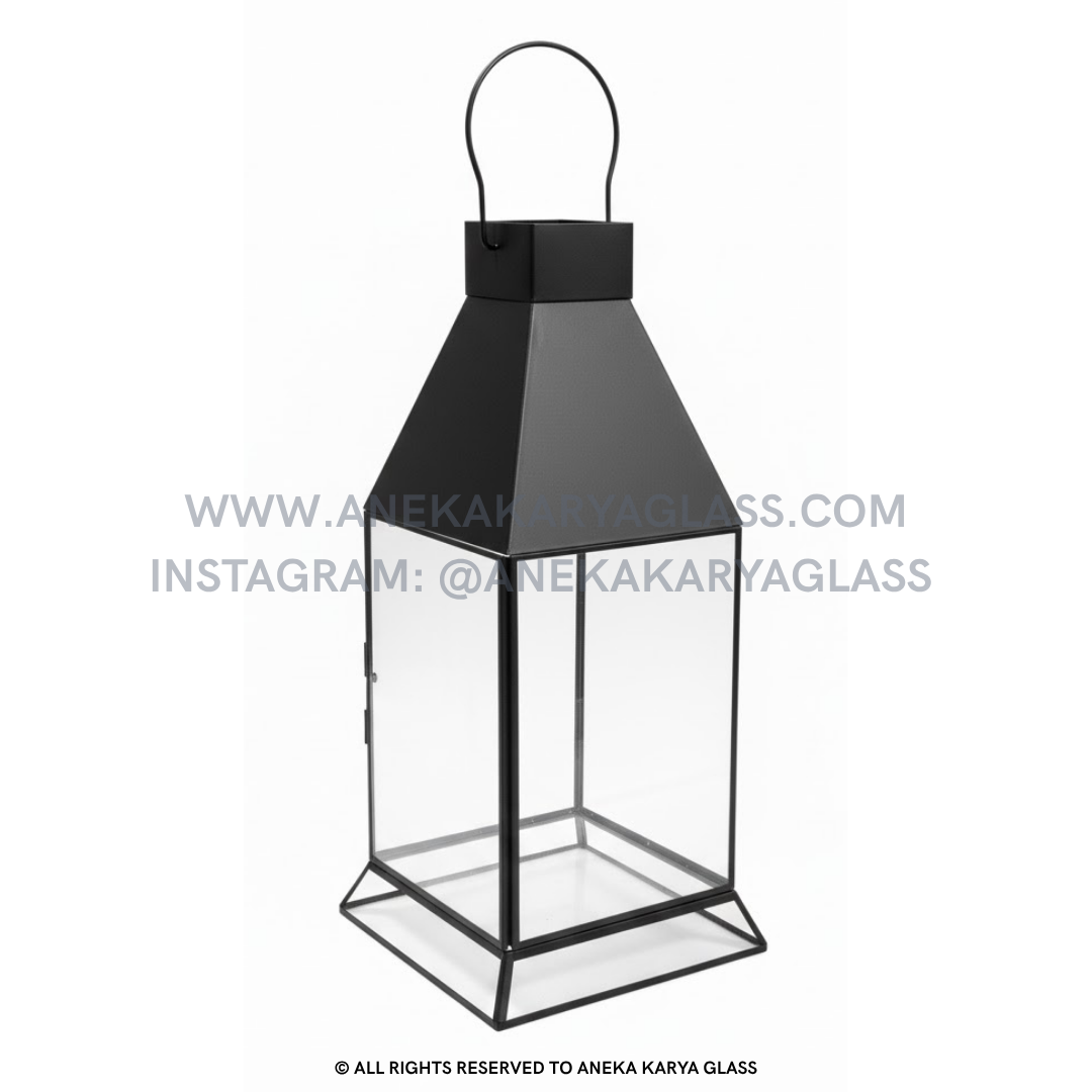 Minimalist lantern made from brass and clear glass, hand-finished in deep brass black for a sleek, modern appearance.