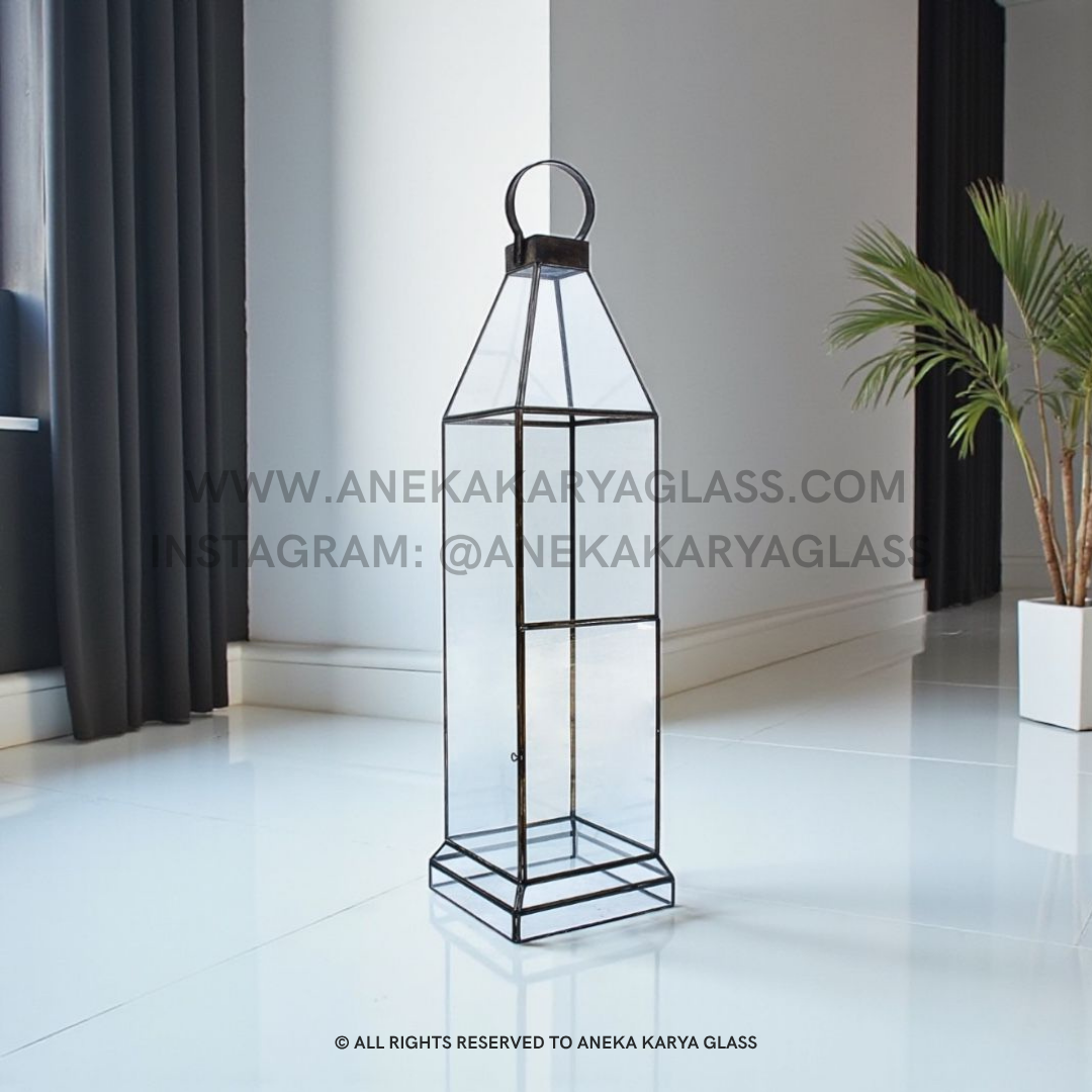 A refined square lantern crafted from beveled glass and antique brass, offering a classic look with subtle details.