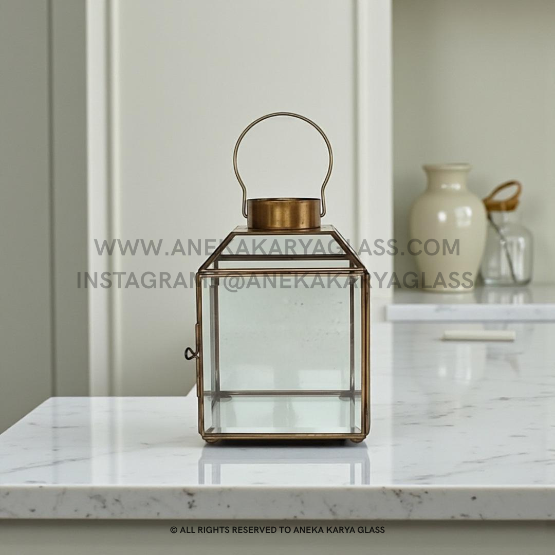 Compact beveled-glass lantern in square shape, designed for refined table or shelf display with antique brass finish.