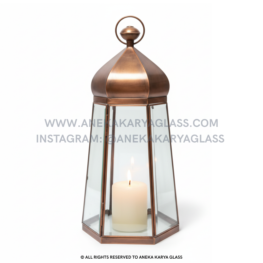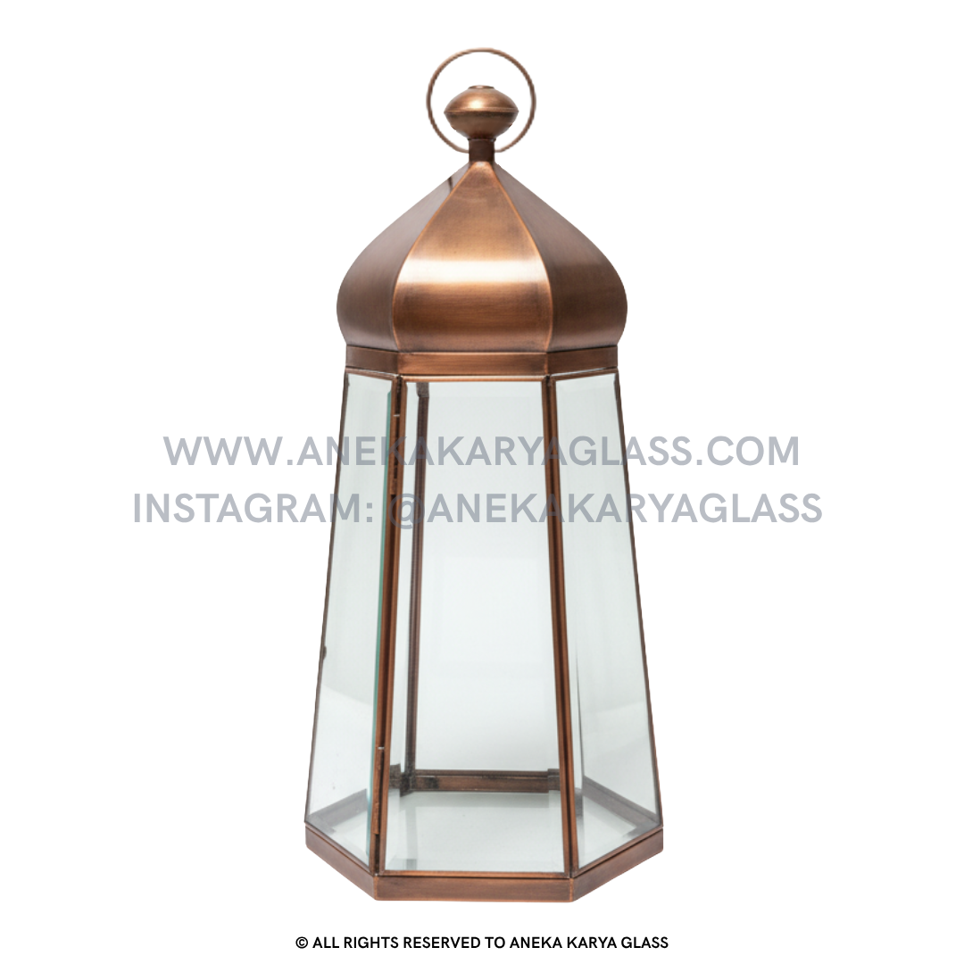 Elegant hexagonal lantern made from brass and beveled glass, handcrafted with antique finishing to create a classic, refined look.