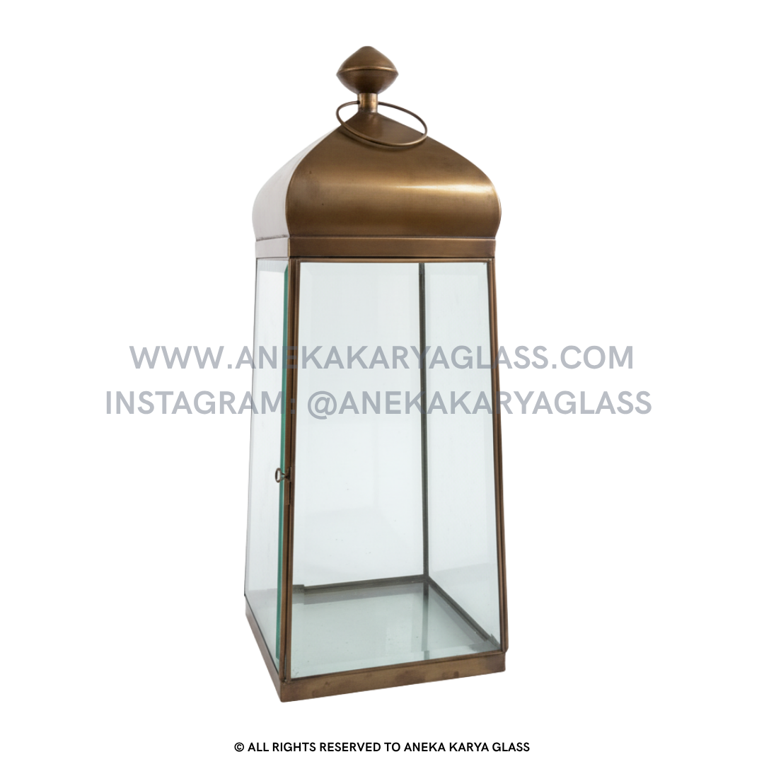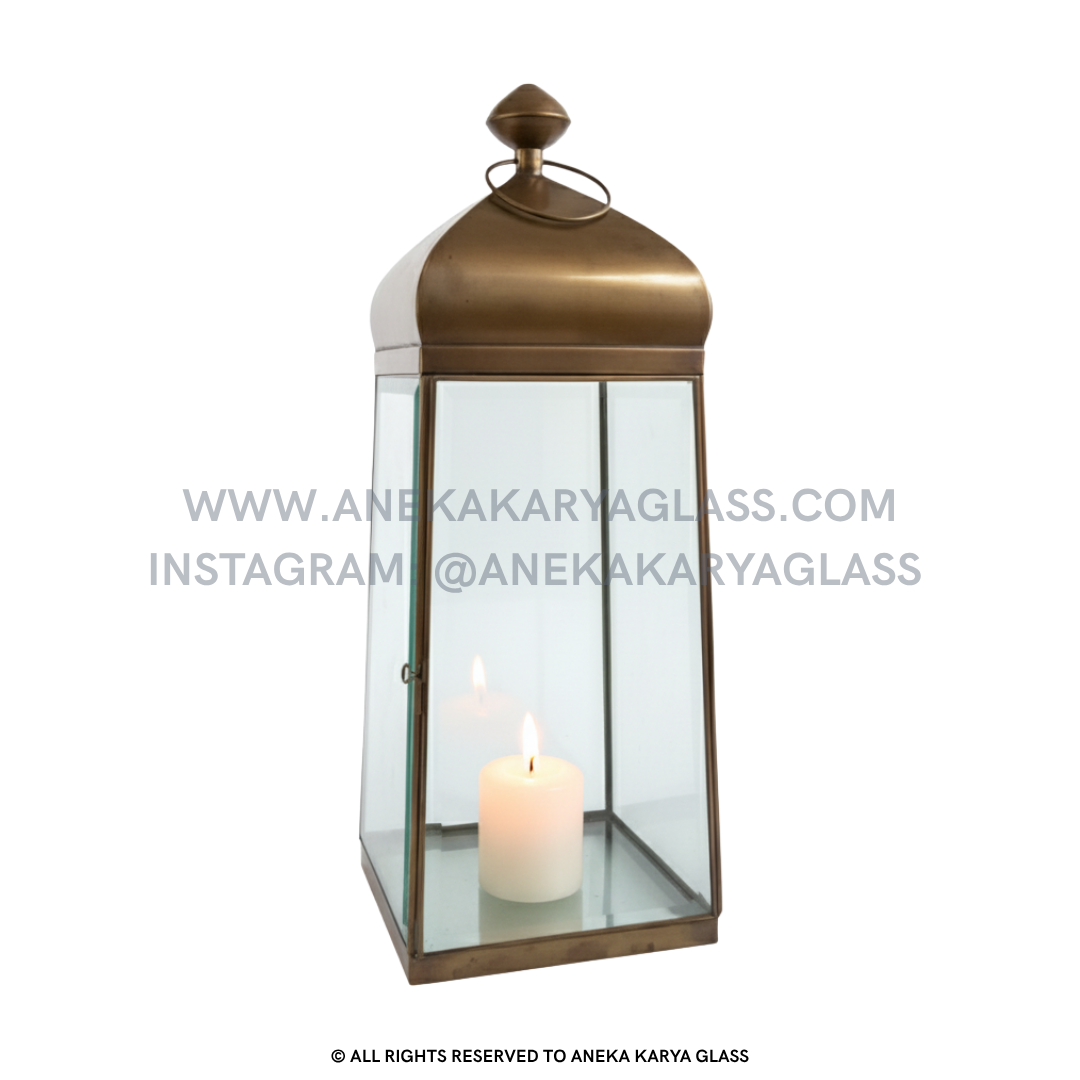 A handcrafted lantern made from brass and glass, featuring beveled glass panels and an antique finish. Designed with timeless simplicity, this piece brings warmth and sophistication to any space.